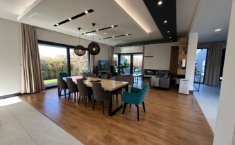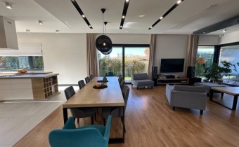 - przestronny salon z dużymi przeszkleniami i wyjściem na dwa tarasy i ogród.