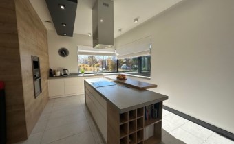 W kuchni meble w zabudowie na wymiar wraz ze sprzętem agd: lodówka, zmywarka, ekspres do kawy, okap, piekarnik z funkcją parową; blaty z betonu impregnowanego; spiżarnia z miejscem do przygotowywania posiłków, meble, regały, dodatkowa zamrażarka.