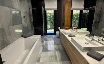 - elegancka łazienka z toaletą, wanną oraz prysznicem, dwie umywalki, lustro.