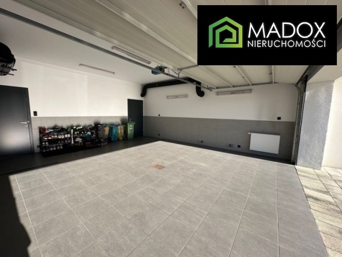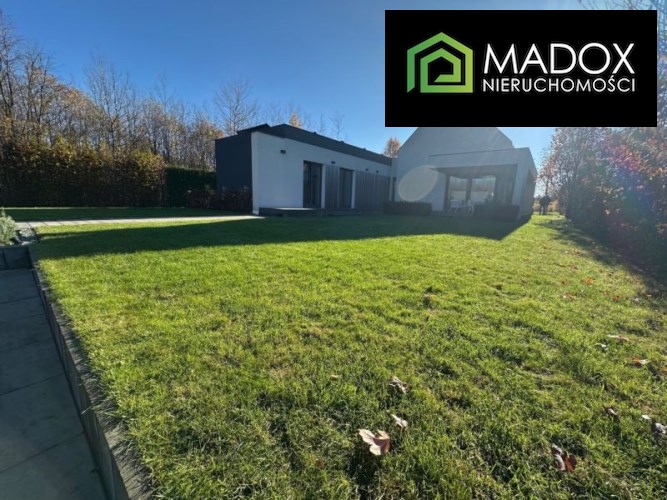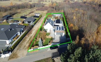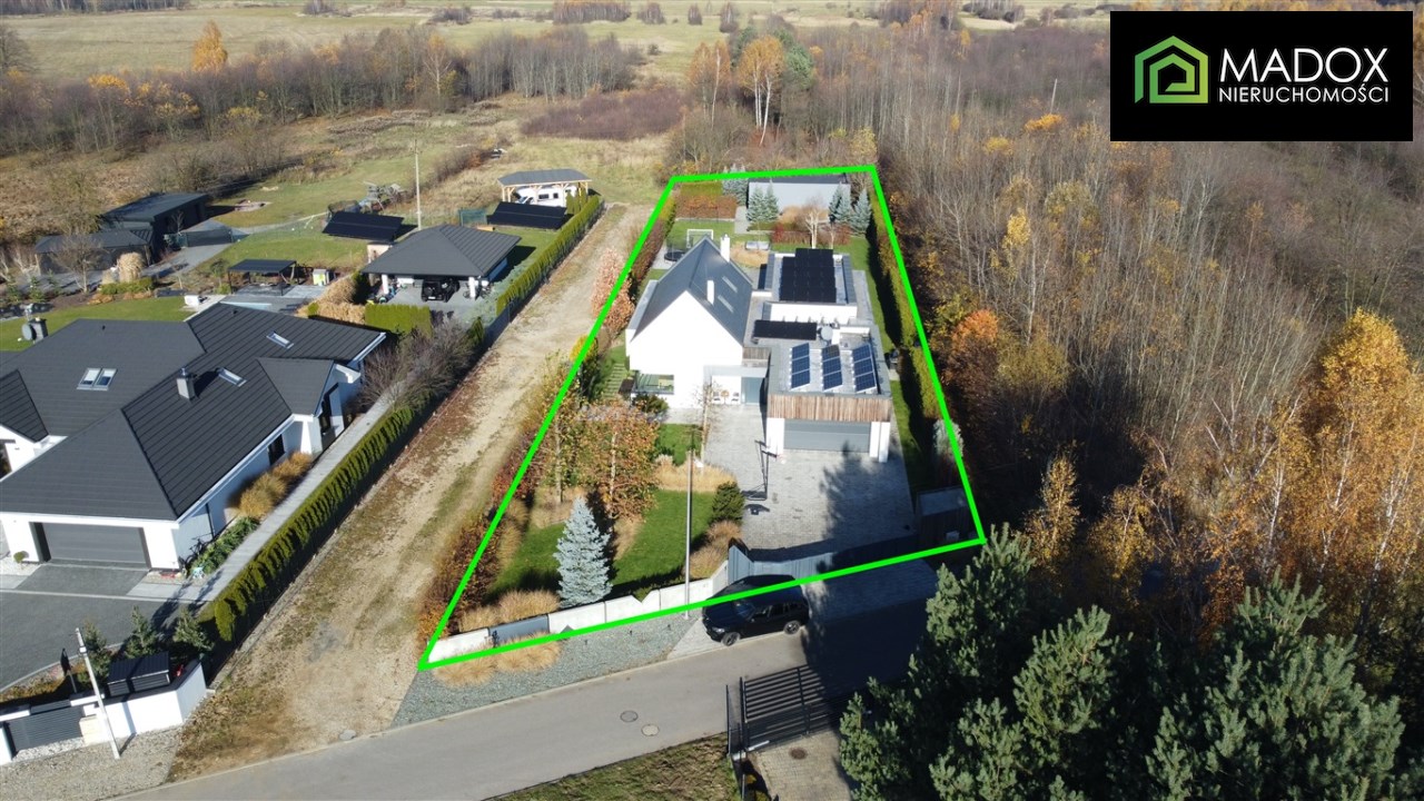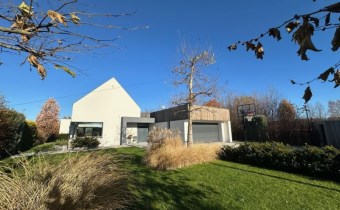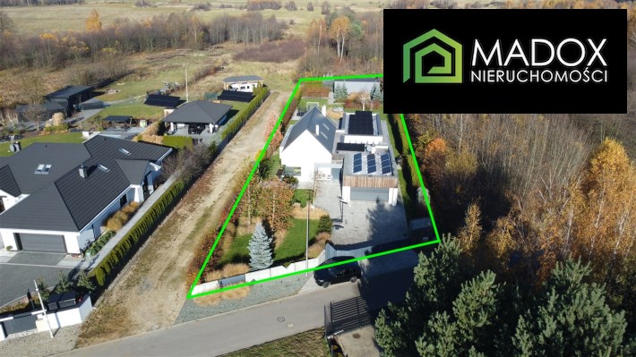 BUDYNEK parterowy z poddaszem, garażem dwustanowiskowym w bryle budynku; wybudowany w 2017 roku z pustaka maxa, na dachu kamień naturalny (łupek), na elewacji tynk oraz drzewo (modrzew syberyjski). Stolarka okienna aluminiowa, duże przeszklenia; Tarasy wyłożone drzewem egzotycznym tatajuba.