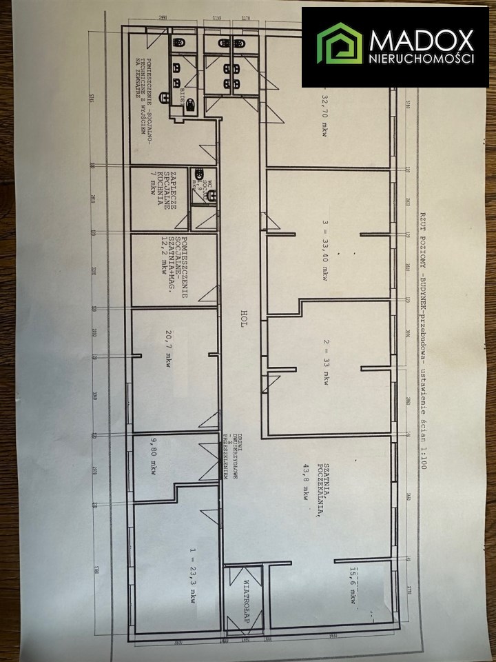 - 5 sal/ pomieszczeń z możliwością podziału na mniejsze (33 m2, 33,40 m2, 32,70 m2, 23,3 m2, 20,7 m2)