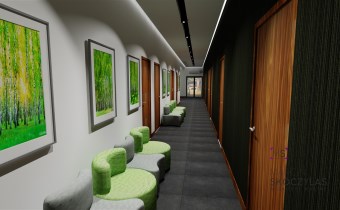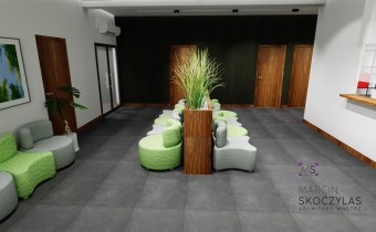 - Recepcja ( część reprezentacyjna) 43,8 m2 z dodatkowym pomieszczeniem 15,6 m2;