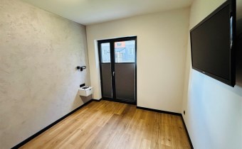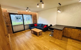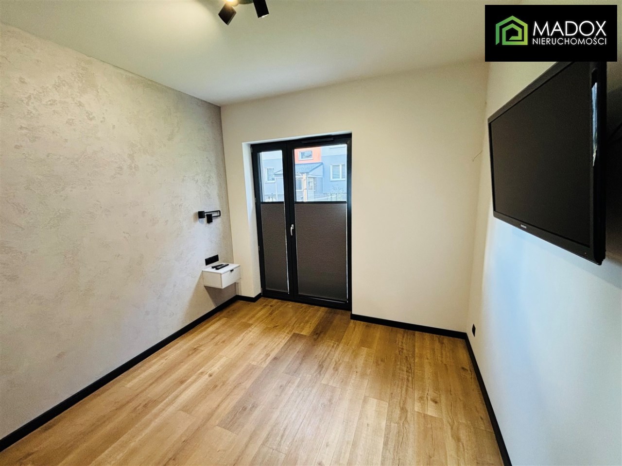 tynk imitujący beton oraz cegła dekoracyjna, na podłodze panele winylowe; stolarka okienna plastikowa (trzyszybowa) z plisami wewnętrznymi, w salonie okno typu HS; drzwi wewnętrzne POL-SKONE;