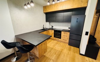 Zabudowa kuchenna na wymiar wraz ze sprzętem AGD (lodówka HAIER, zmywarka BOSCH (60cm), piekarnik parowy oraz płyta indukcyjna ELECTROLUX zintegrowane z okapem), armatura HANSGROHE;