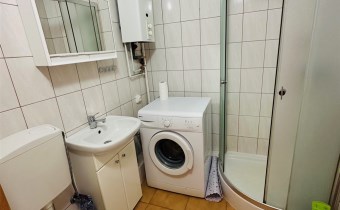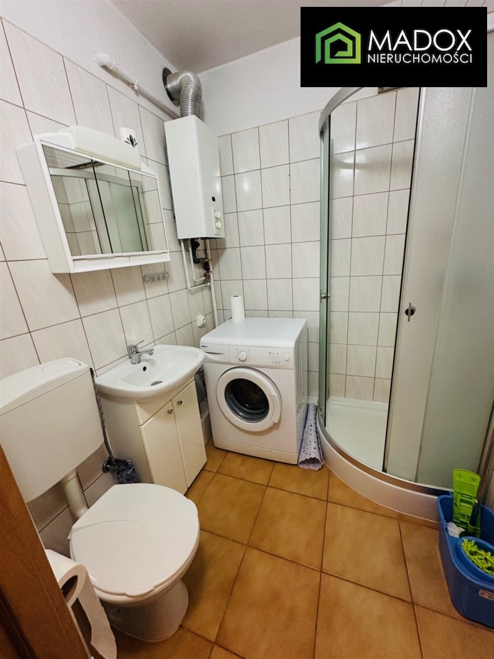 ŁAZIENKA wraz z WC kabina prysznicowa, umywalka z szafką, lustro, pralka, piecyk gazowy