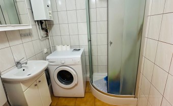 ŁAZIENKA wraz z WC kabina prysznicowa, umywalka z szafką, lustro, pralka, piecyk gazowy