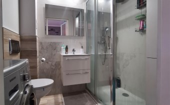 ŁAZIENKA z wc w nowoczesnej glazurze, nowy bojler elektryczny, na wyposażeniu pralka.
