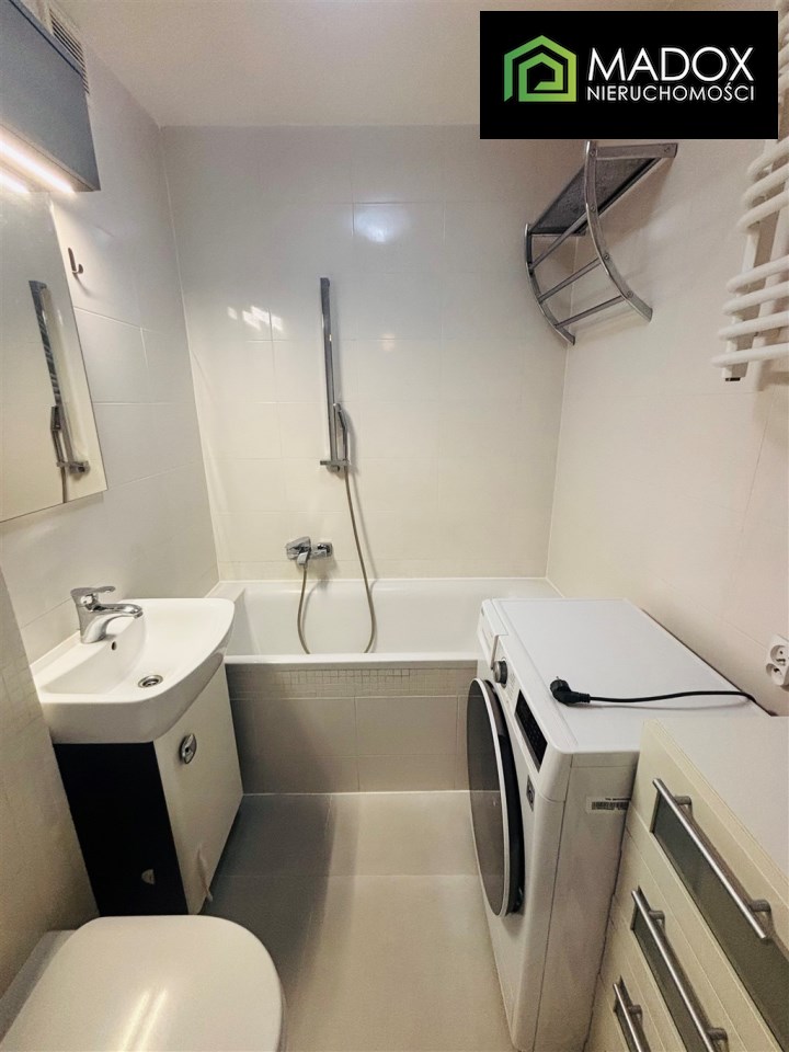 - łazienka w jasnej, nowoczesnej glazurze, wyposażona w pralkę
