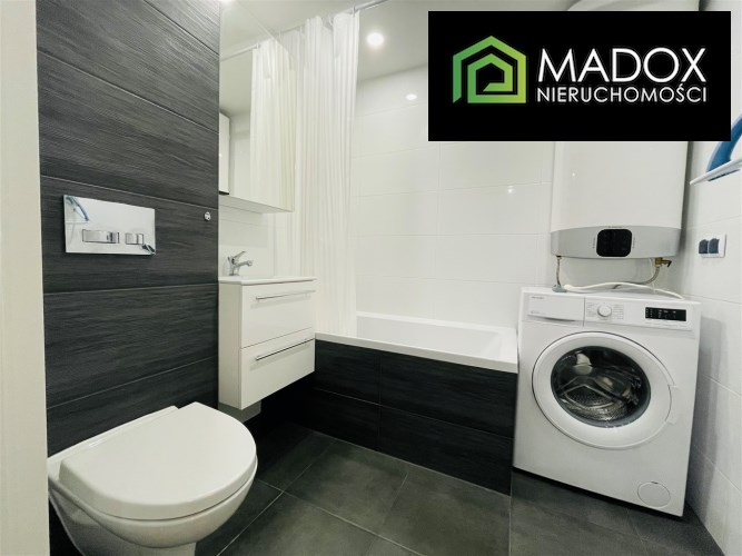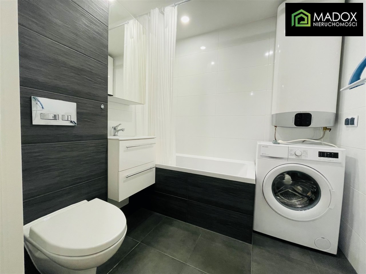 ŁAZIENKA wraz z WC w nowoczesnej glazurze, wanna, umywalka z szafką, pralka