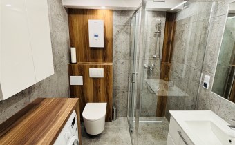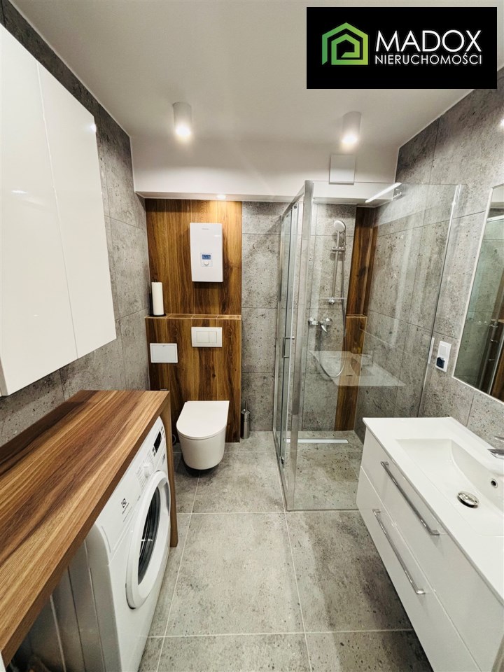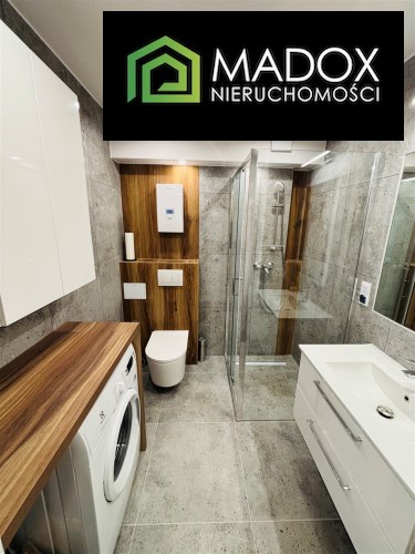 duża ŁAZIENKA- kabina prysznicowa, umywalka z szafką, szafka wisząca, lustro, pralka;